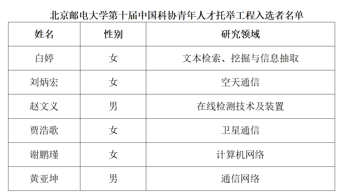 近日,中国科协发布“第十届青年人才托举工程人选名单公示”,共遴选出987名青年科技工作者入选第十届中国科协青年人才托举工程,北京邮电大学共有6名老师入选。