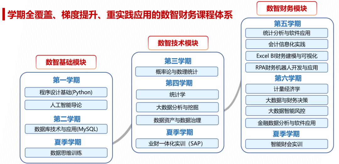 01面向未来的人才培养大数据、人工智能融入课程,构建学期全覆盖、梯度提升、重实践应用的数智财务课程体系,通过数据驱动和信息赋能,培养具备数字财务和智慧管理能力的创新人才。