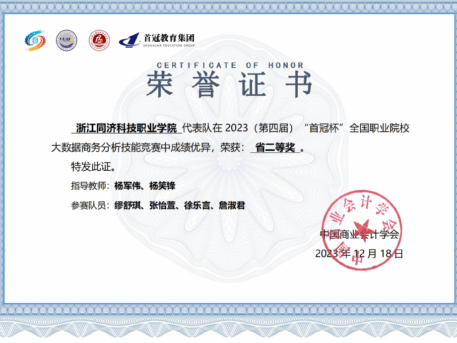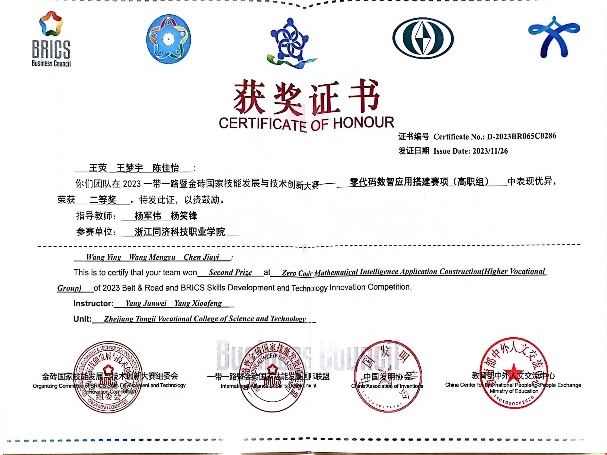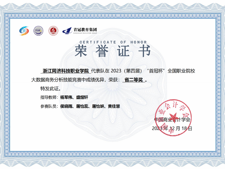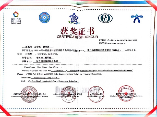 专业首次招生不到1年就在多项赛事取得骄人成绩,分别在“2023年第四届首冠杯全国职业院校大数据商务分析技能竞赛”“2023年全国零代码数智应用搭建赛”、“2023年全国网中网杯高等职业院校商务数据分析技能大赛”等赛项获得二等奖、三等奖各3项。