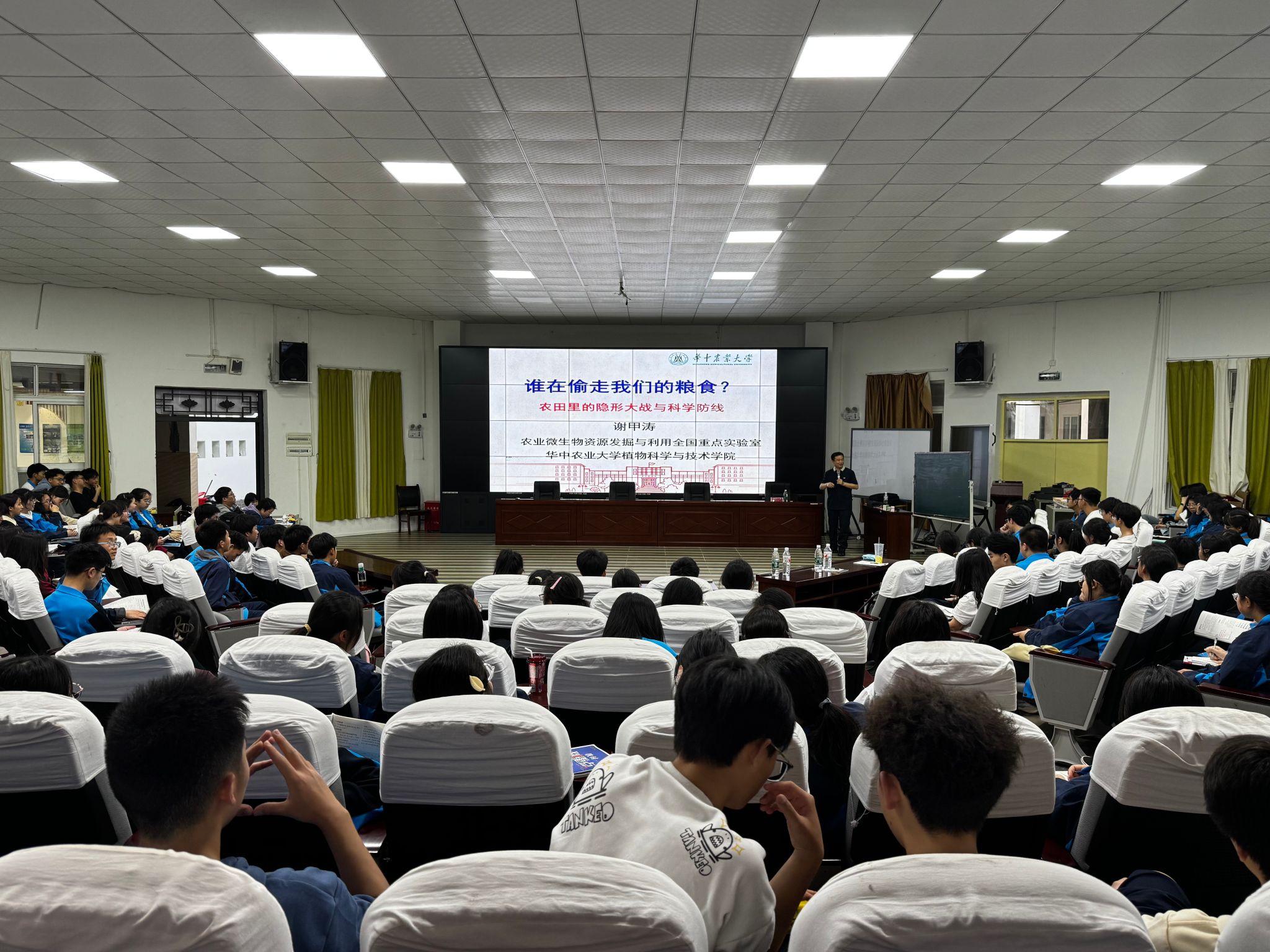 “我国粮食为什么紧缺?究竟是谁偷走了我们的粮食?”谢甲涛通过生动的图片与诗词典故,揭开了偷走粮食“真凶”的神秘面纱。他以别开生面的视角向同学们介绍了吃水稻的鸟、田间流窜的鼠、除不尽的杂草、吸附植物的寄生物、蚕食植物的昆虫、钻到植物根茎的线虫、潜伏的植物病毒、让植物生病的细菌、“吃素”的真菌、抢占资源的外来入侵生物等“偷粮凶手”。他谈到,病虫害严重危害着农业生产,世界粮食生产因病虫草害常年损失约37%,病虫害防治是粮食稳产增收的关键一步。