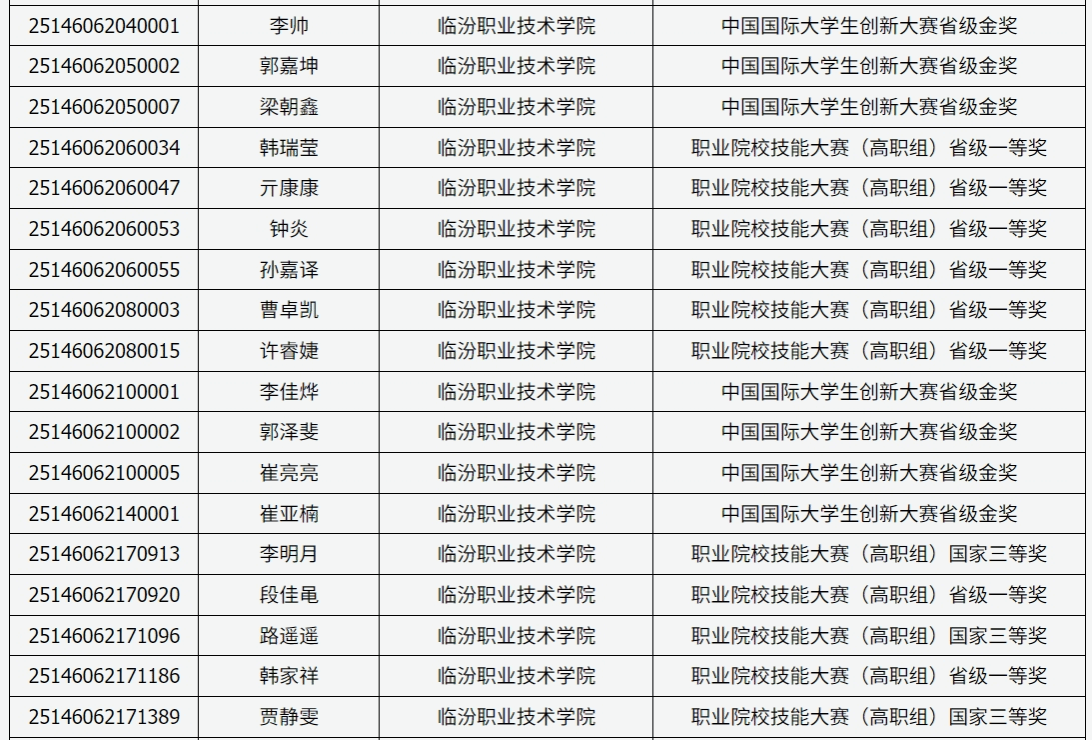 山西省2025年普通高校专升本考试获奖加分考生名单公示(仅截取临汾职业技术学院部分)