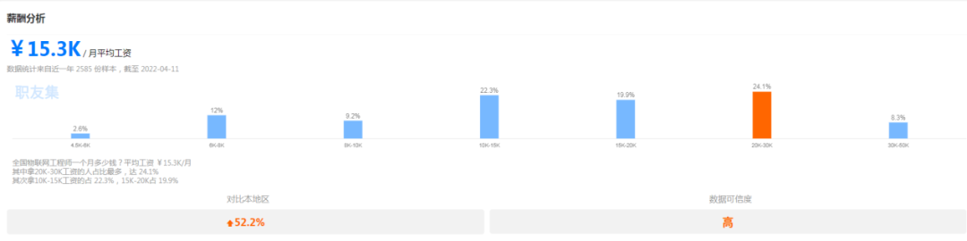 根据「职友集」2023年-2024年近一年调查显示,全国物联网工程师平均工资约为15300元/月(取自 2585 份样本);