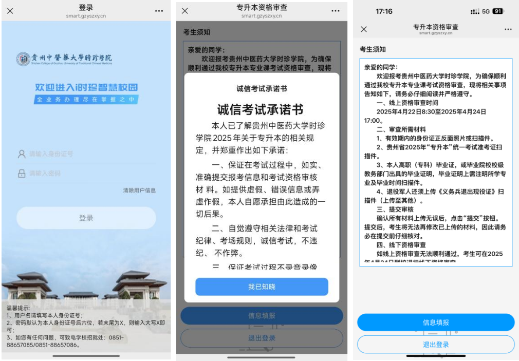 第二步: 进入系统登录→确认知晓诚信考试承诺书及考生须知