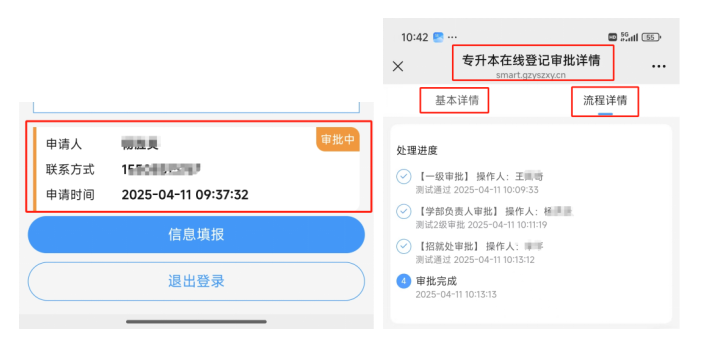 查询进度:提交后点击下方位置,可在系统中“查看登记审批详情”,实时跟踪审核状态。