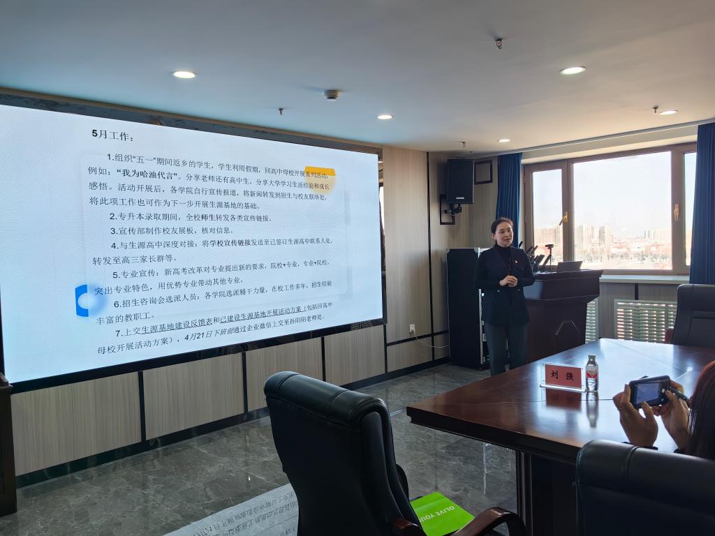 招生与校友联络处处长刘洋首先对近期各二级学院近期的招生宣传工作进行总结汇总,并对如何与高中深度对接提出意见和建议,最后刘洋处长对下一阶段招生宣传工作的具体安排进行了详细部署。她强调专升本录取工作及普通本科招生宣传已经全面启动,要求各二学院加强宣传意识,创新宣传形式,要充分调动校友资源,组织优秀毕业生回访母校高中开展系列等活动。