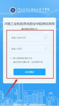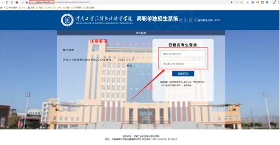 1.访问我校单招系统(网址:http://ddzs.hciit.edu.cn/),建议使用360浏览器(极速模式)或者谷歌浏览器,在输入框内输入账号(账号为本人身份证号)和密码(密码默认为本人考生号后6位)登录系统(初次登录后可更改密码)。