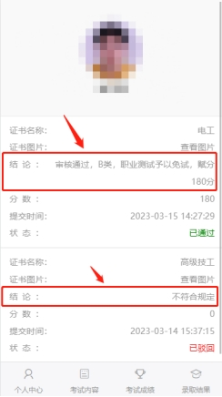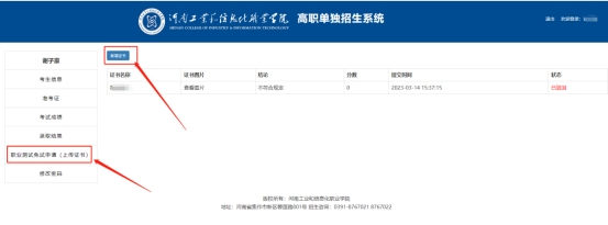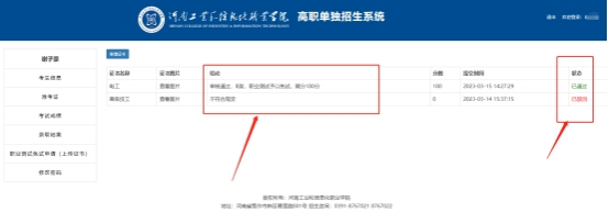 4.考生上传的证书经我校集中审核后,将通过本系统反馈审核结果。届时点击左侧“职业测试免试申请(上传证书)”按钮可以查看审核结果。