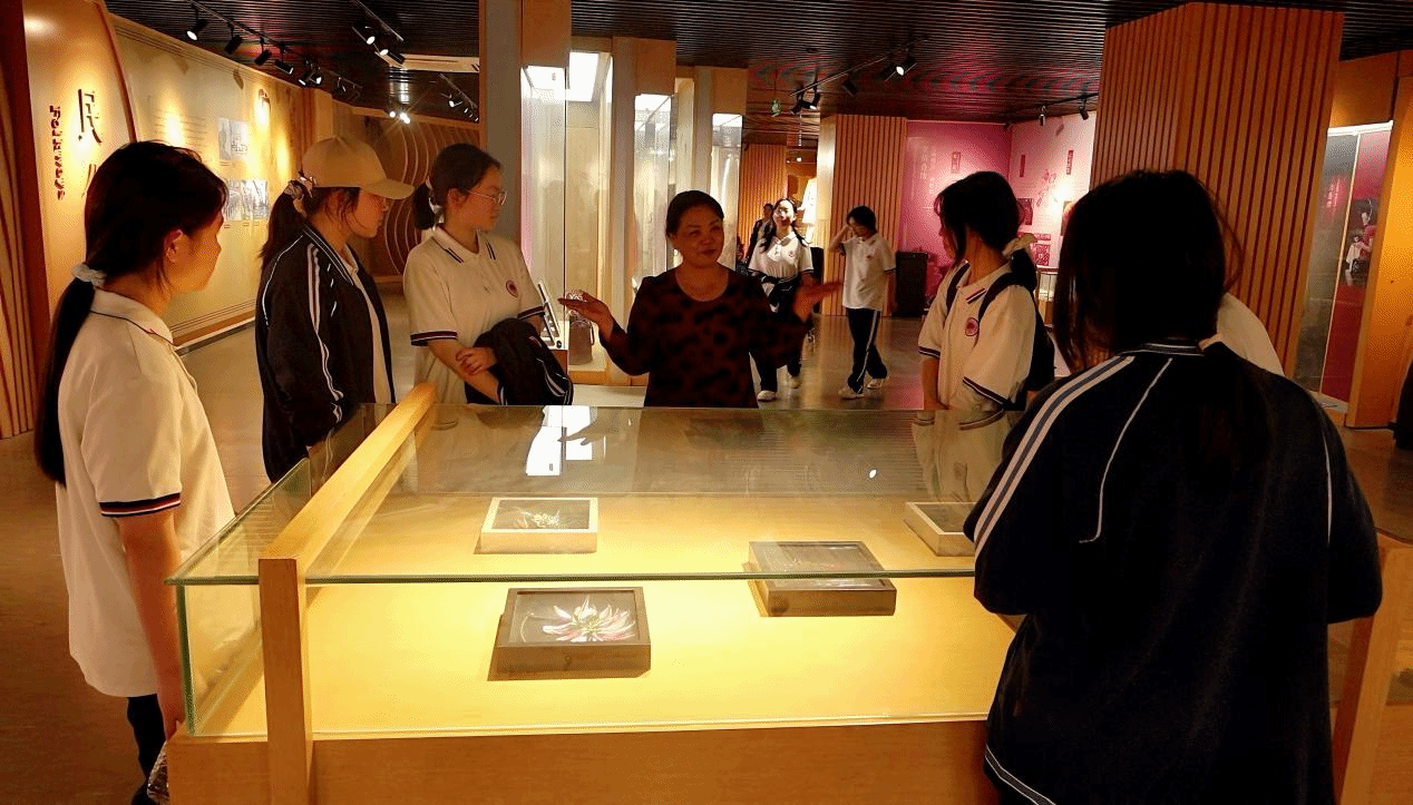 在各学院文化艺术展厅里,应城一中师生沉浸式感受非遗技艺的千年脉络,认真听取老师的讲解古代纺织科技的奥秘,西兰卡普纹样、大悟织锦带图腾与天门蓝印花布等精美展品让学生久久驻足欣赏。