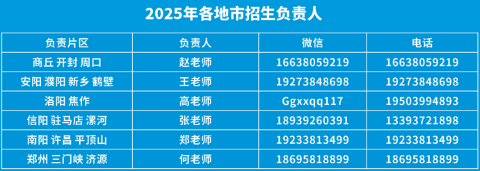 为方便考生咨询,我校设置了各地市招生负责人,具体信息如下: