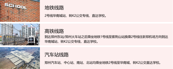 高铁线路:到达郑州东站/郑州火车站之后,乘坐地铁1号线至紫荆山站换乘2号线往新郑机场方向到达华南城站,转K2公交专线,直达学校。