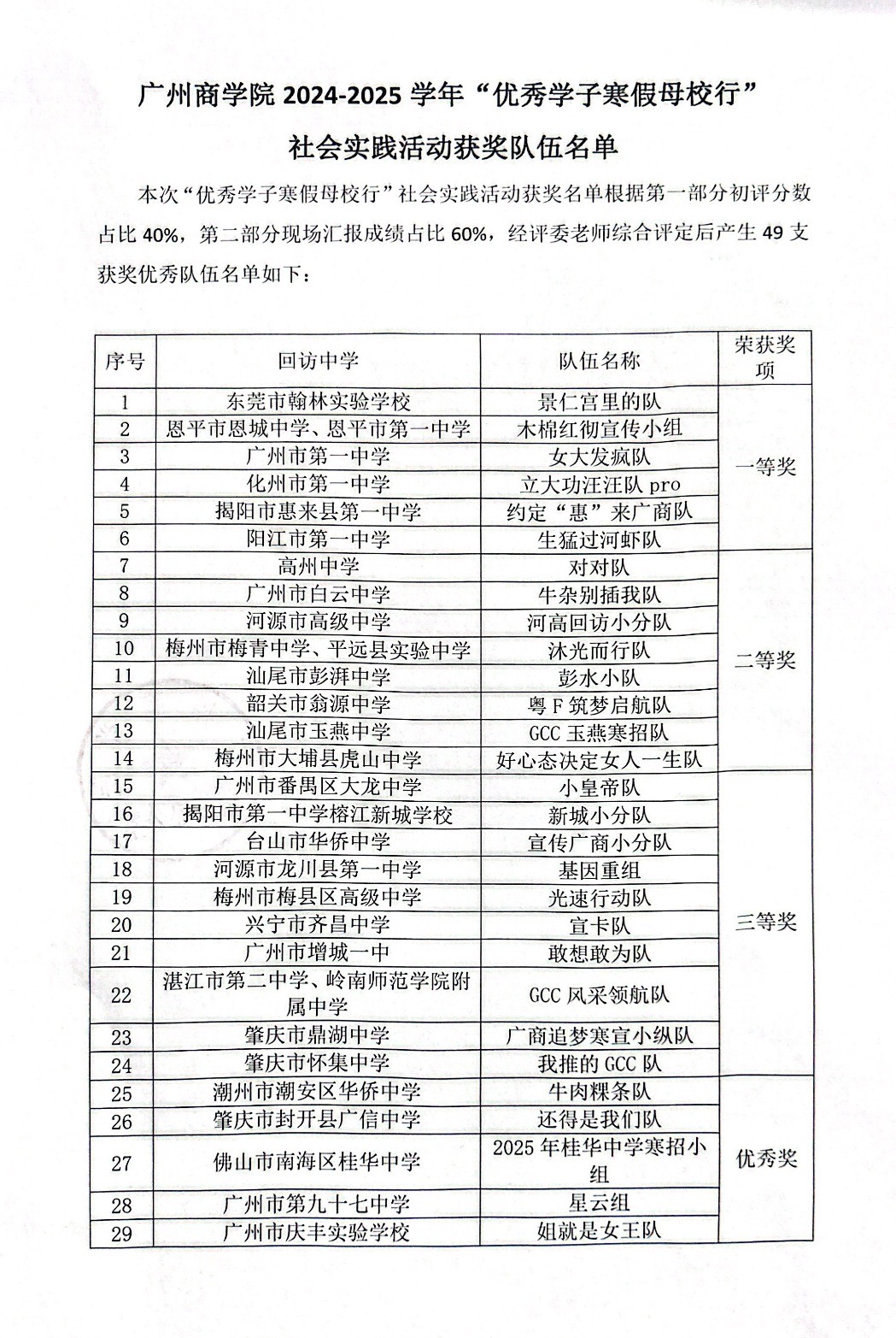 关于广州商学院2024-2025学年“优秀学子寒假母校行”社会实践活动获奖队伍名单的公示