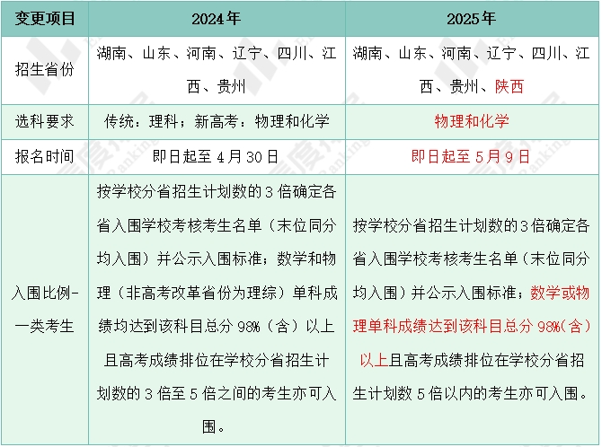今年报名时间相比去年有所延后。数学、物理成绩极为优秀的第一类考生,入围要求有所降低,去年要求数学和物理成绩均达到该科总分的98%及以上,且高考成绩在招生计划的5倍以内才能入围;今年只需其中一科达到总分的98%及以上,且高考成绩在招生计划的5倍以内就能入围。