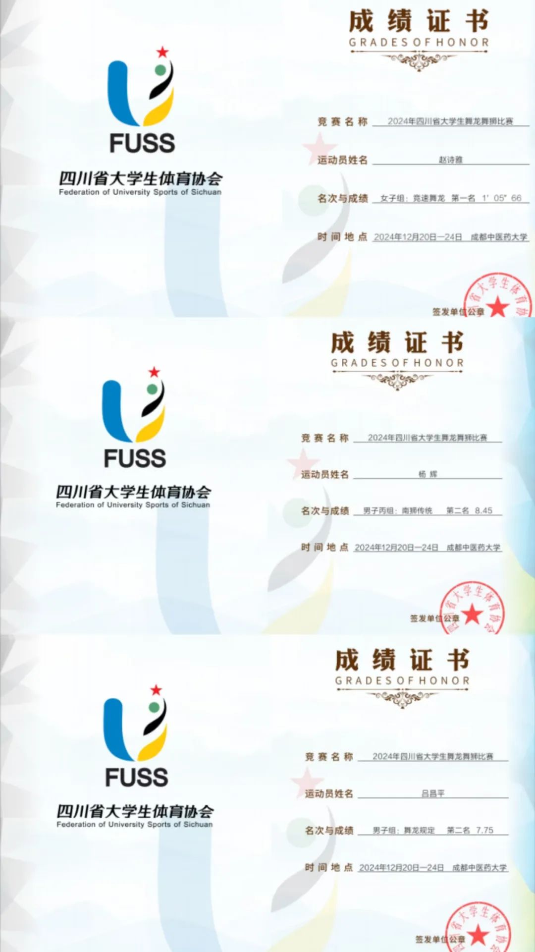 舞龙舞狮训练队在2024年四川省大学生舞龙舞狮”比赛中获得女子组竞速舞龙第一名、男子组舞龙规定第二名、男子丙组南狮传统第二名。