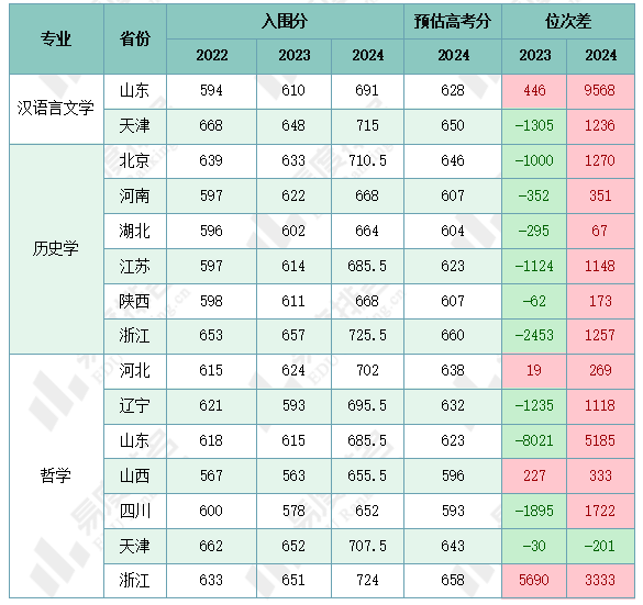 2023年位次差=2022年入围分对应位次-2023年入围分对应位次,2024年位次差=2023年入围分对应位次-估算2024年高考文化成绩对应位次。位次下降表示入围难度降低,反之则代表入围难度加大。
