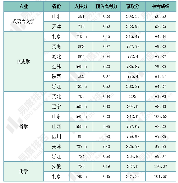 注:1.综合成绩=高考成绩/高考成绩满分*850+ 学校考核成绩,校考成绩是使用入围分算出预估高考分作为高考文化成绩得出,校考满分150分;2.红色代表校考成绩大于150分