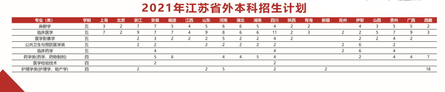 徐州医科大学2021年省外本科招生计划汇总表