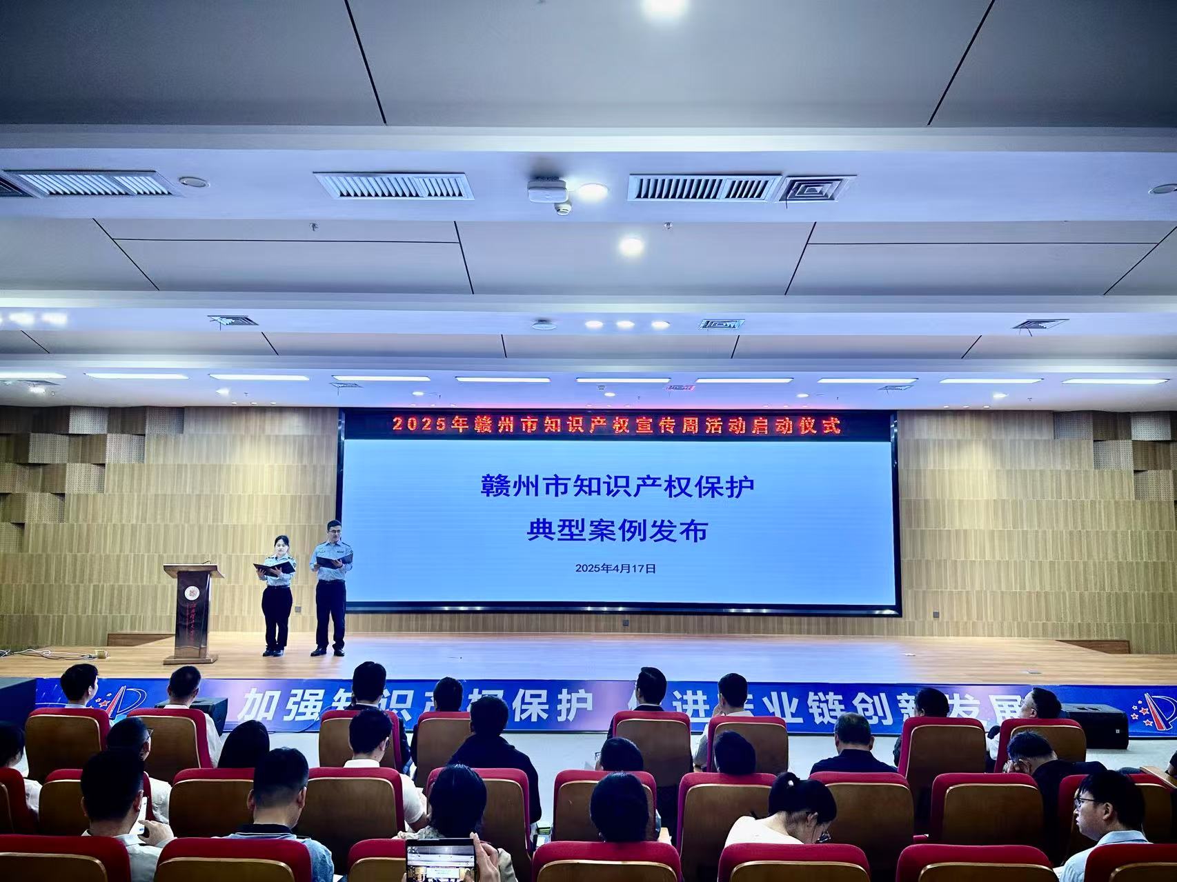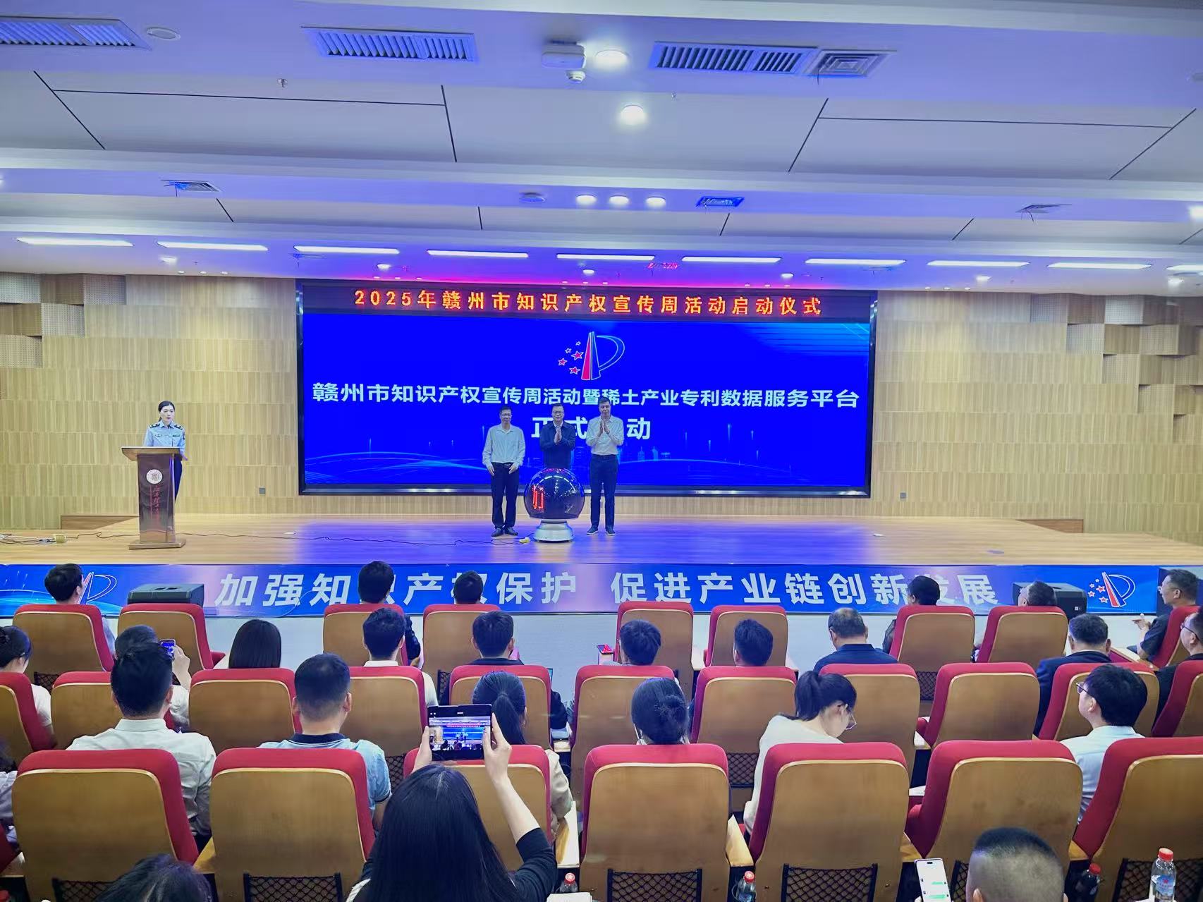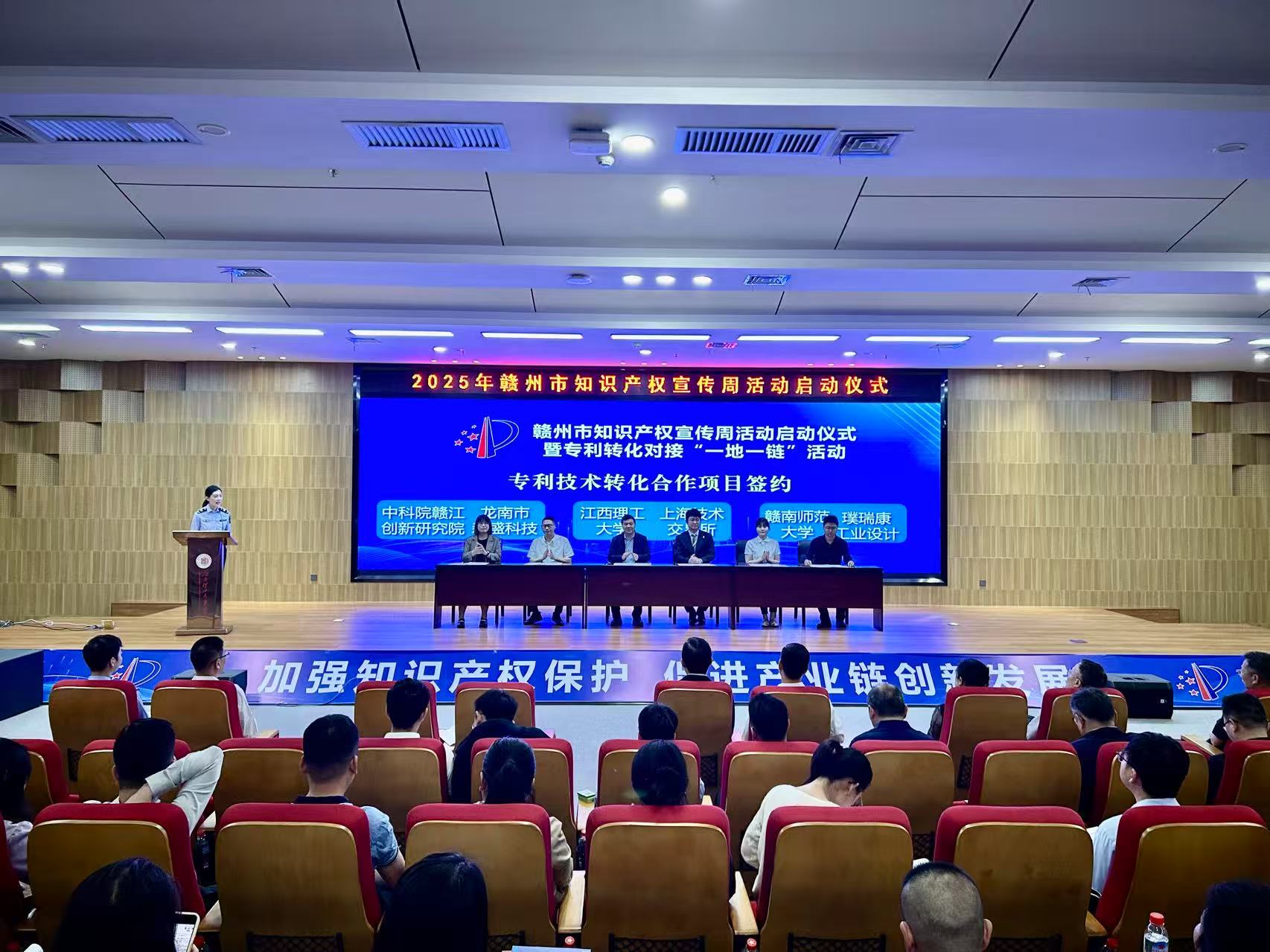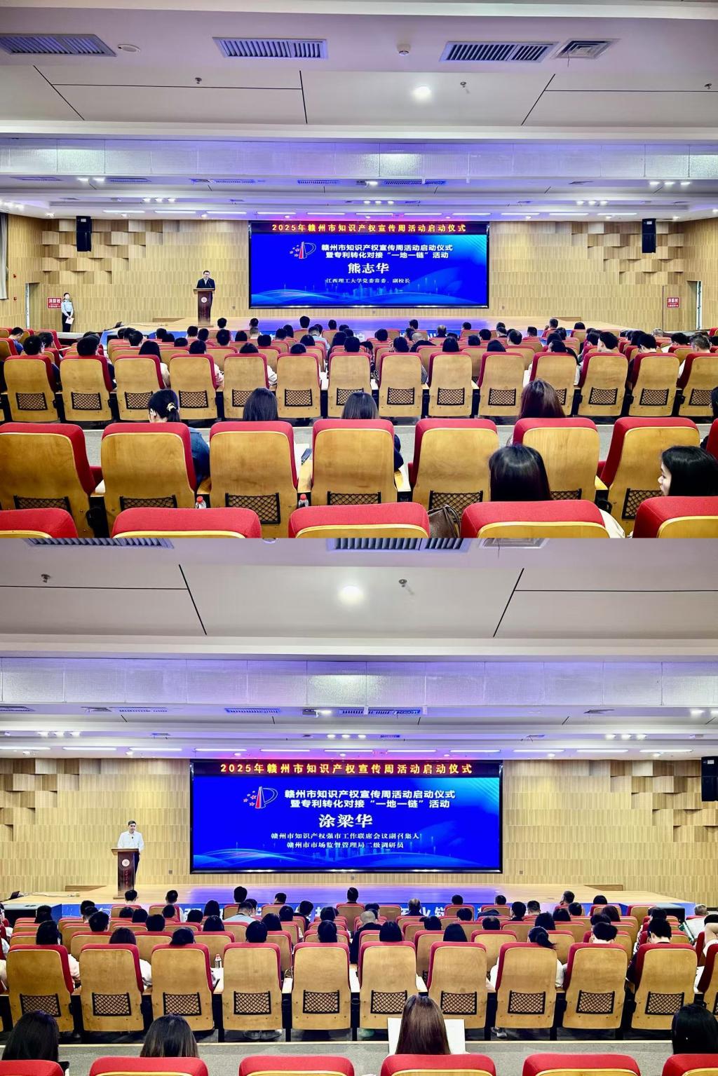 本网讯 4月17日上午,2025年赣州市知识产权宣传周活动启动仪式暨专利转化对接“一地一链”活动在江西理工大学举行,正式拉开我市“4·26”世界知识产权日系列宣传活动帷幕。该活动作为我市政府开放活动的重要组成部分,通过搭建政民互动平台,全面展示市知识产权工作成效。市质量(标准、知识产权)强市工作联席会议有关成员单位,高校、企业代表近200人出席本次活动。