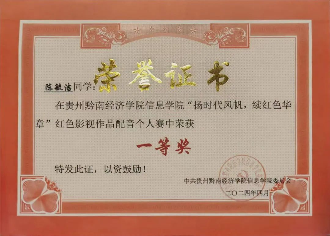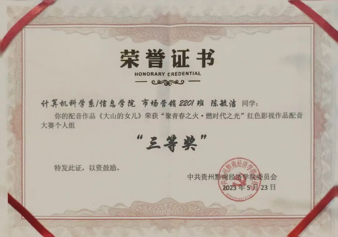 陈毓洁(左二)参加学校红色影视作品配音比赛为进一步拓展自己的知识视野不断挖掘自身专业潜能她积极参加各类学科竞赛读书分享活动以及红色影视作品配音比赛并荣获正大杯第十五届全国大学生市场调查与分析大赛校赛一等奖第17届中国大学生计算机设计大赛校赛一等奖大学生职业生涯规划大赛省赛铜奖等等