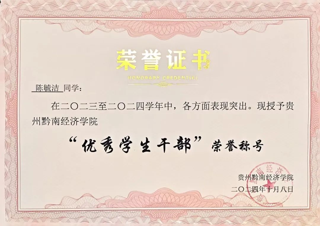 贵州黔南经济学院信息学院市场营销2201班学习委员信息学院学生党建工作中心主任曾获省级优秀学生干部、优秀共青团干部校级三好学生、优秀学生干部优秀迎新志愿者等荣誉称号初期的思考和判断从大一开始陈毓洁就一直担任班级学习委员协助老师处理学习事务帮助同学解决学习问题配合其他班委完成班级团建策划日常秩序维持等工作在此期间她认真负责的工作态度和出色的学习带动能力获得了老师和同学的认可