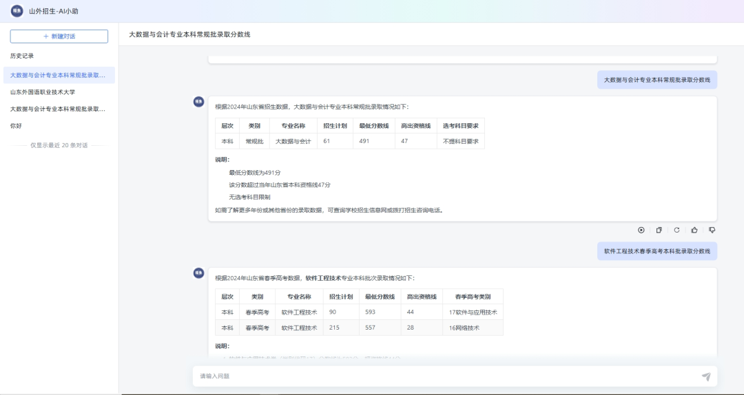 举例而言,当你问“大数据与会计专业本科常规批录取分数线”,“软件工程技术春季高考本科批录取分数线”,系统依托DeepSeek大模型的智能语义理解技术,能够自动关联对话历史信息,为您提供更智能、更个性化的解答服务!