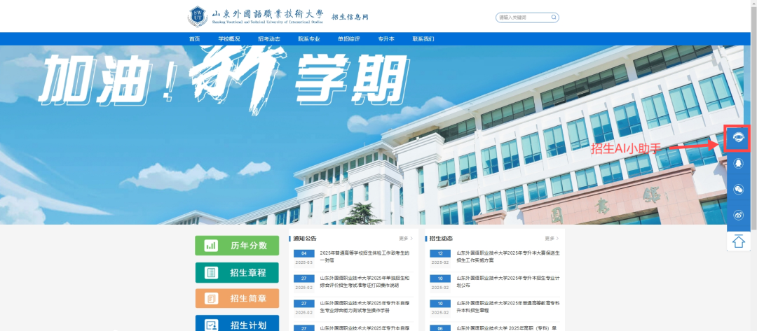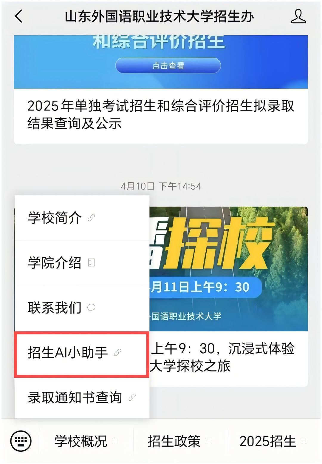 关注山东外国语职业技术大学招生办微信公众号,查找底部“菜单栏”,选择【学校概况】,点击【招生AI小助手】,进入在线咨询平台,随问随答,获取权威招生解答!