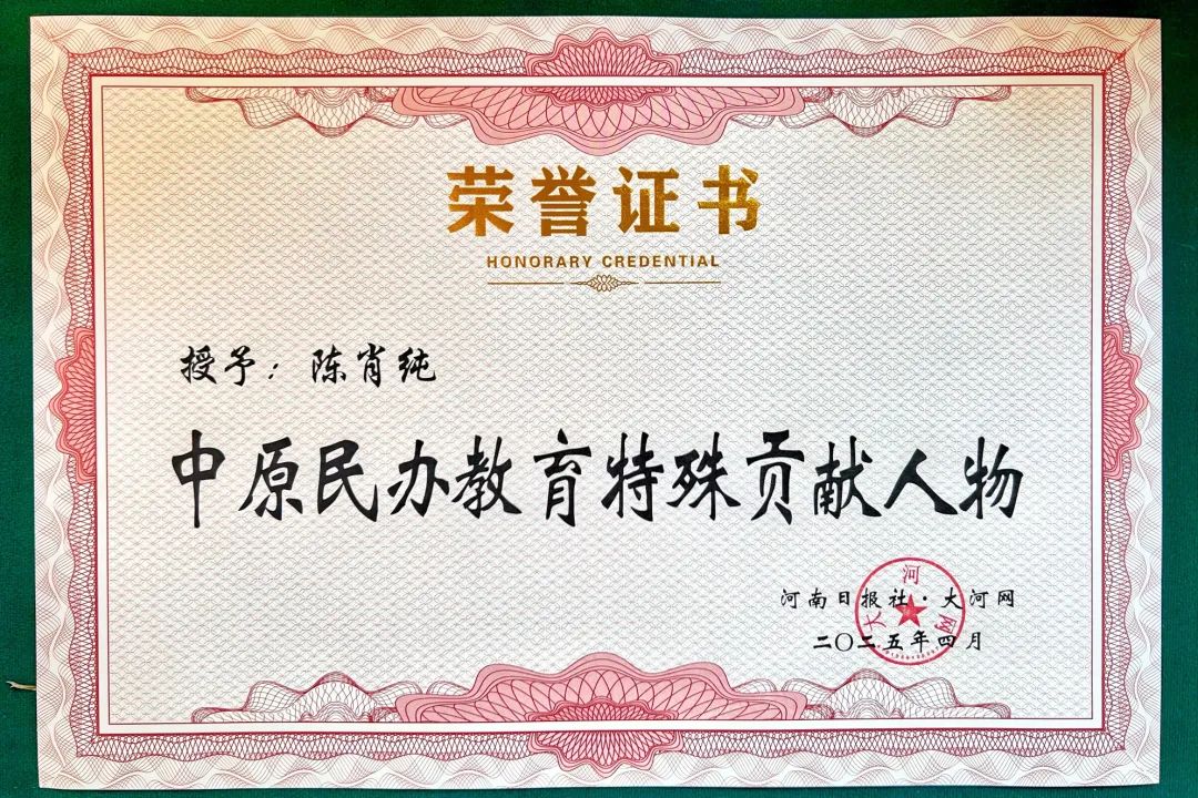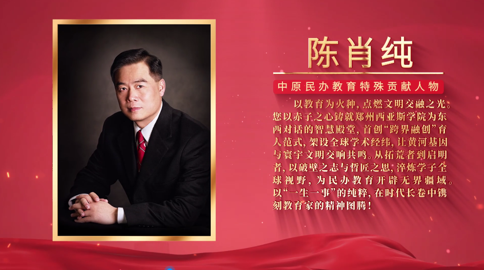 ▲郑州西亚斯学院创办人陈肖纯理事长荣获“中原民办教育特殊贡献人物”称号