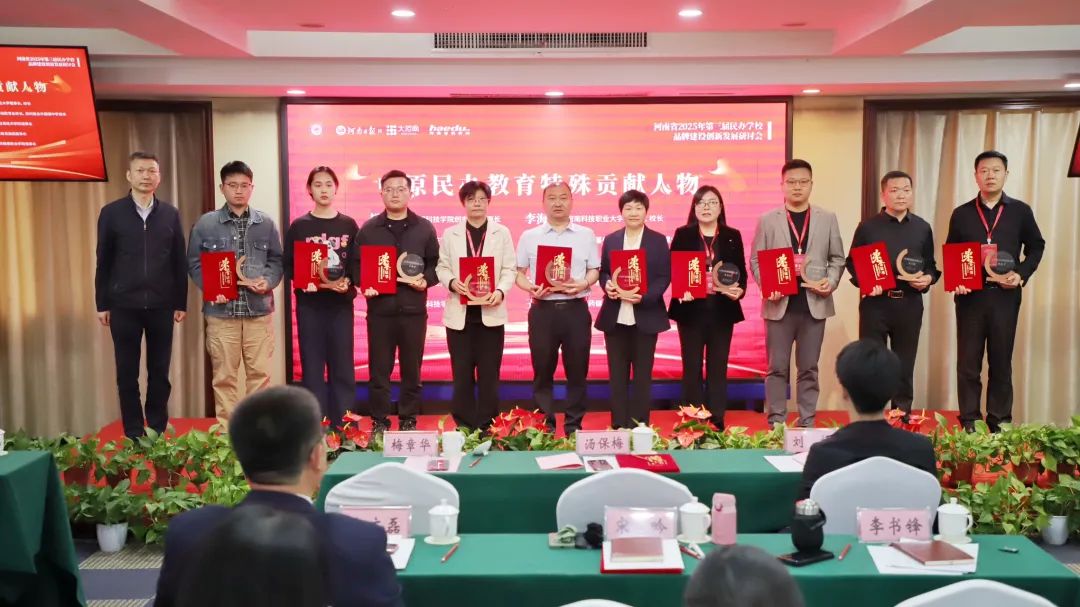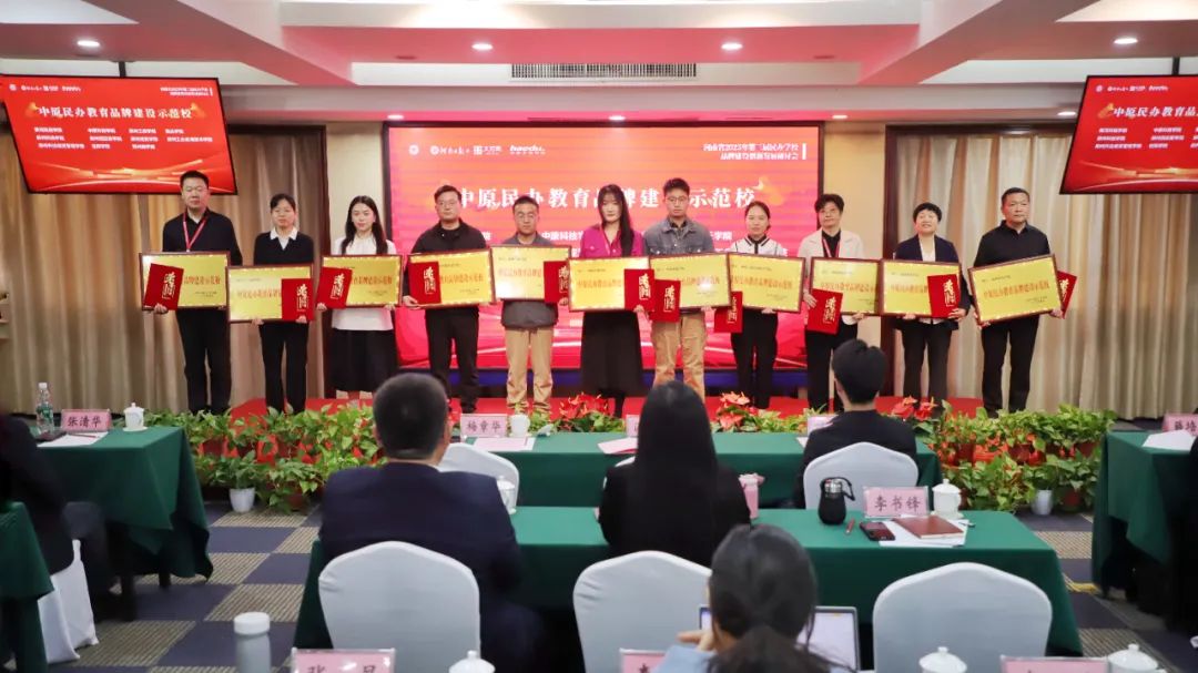 ▲郑州西亚斯学院获评“中原民办教育品牌建设示范校”(右3)