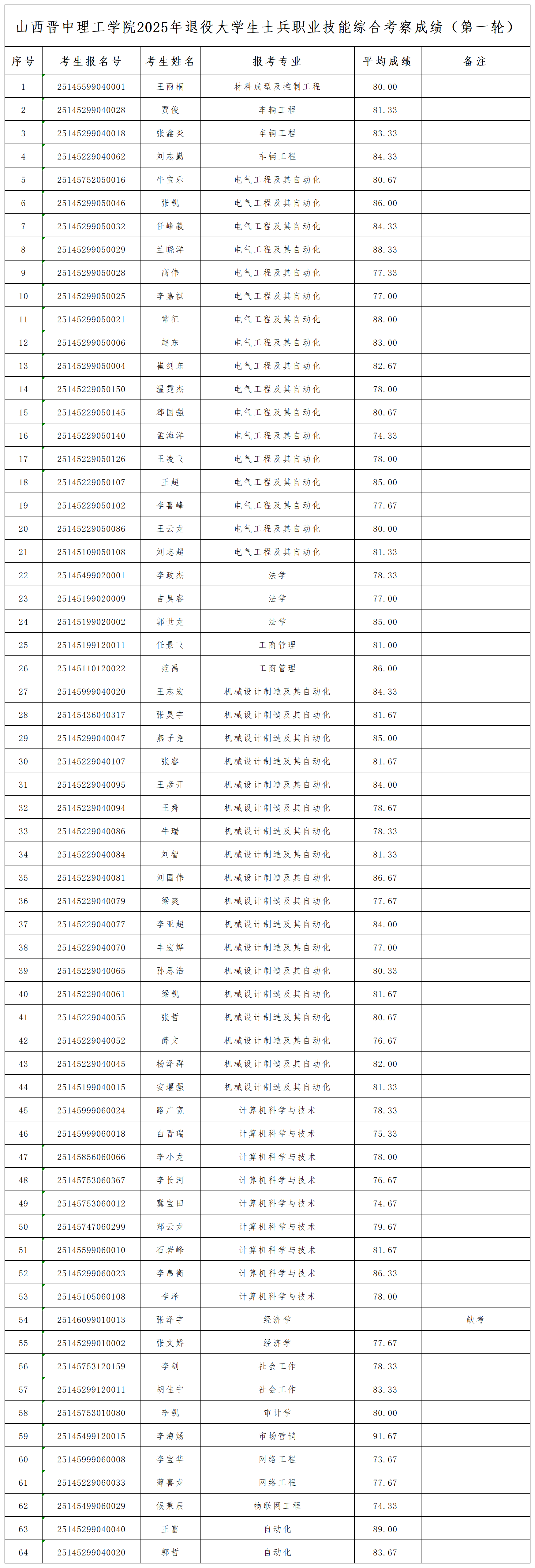 根据山西省招生考试管理中心发布的《山西省教育厅山西省退役军人事务厅 山西省军区动员局关于做好2025年普通高等学校专升本考试招生工作的通知》(晋教高〔2024〕9号)、《山西省招生考试管理中心关于做好2025年普通高校专升本考试报名工作的通知》(晋招考研〔2024〕16号)的通知要求,我校于2025年4月21日组织了退役大学生士兵专升本校内职业能力测试工作,并对测试成绩及63名拟录取学生进行公示: