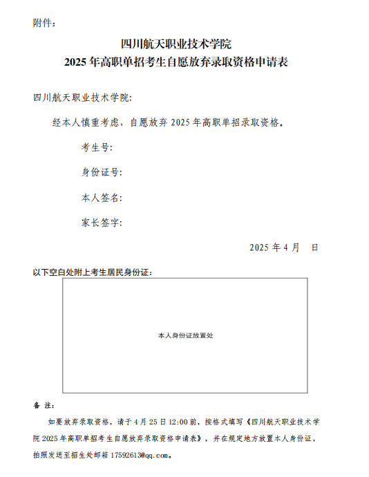 投档到我校的考生可以在2025年4月25日中午12:00前申请放弃录取资格。拟申请放弃录取资格的考生请考生本人手写放弃录取申请书,由家长和考生本人签字并将考生本人身份证放置在申请书上,拍照后以图片形式发送至学校招生处邮箱(17592613@qq.com),逾期不再接受放弃录取申请。