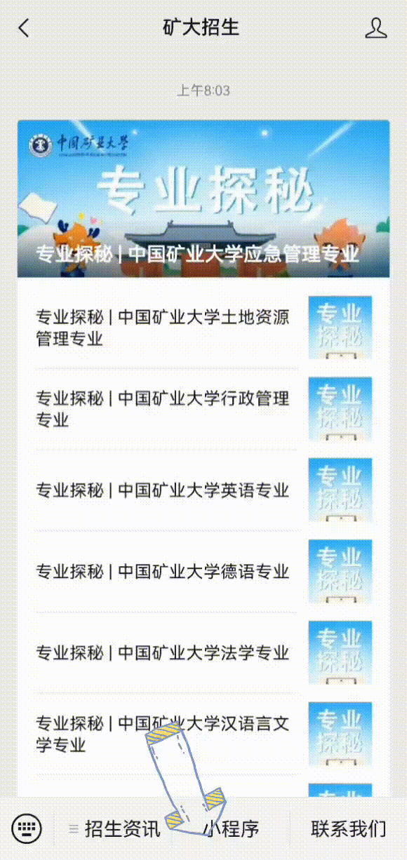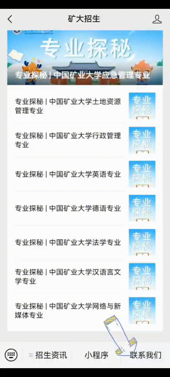 微信搜索“矿大招生”(cumtzs),并可在输入栏直接留言进行咨询。