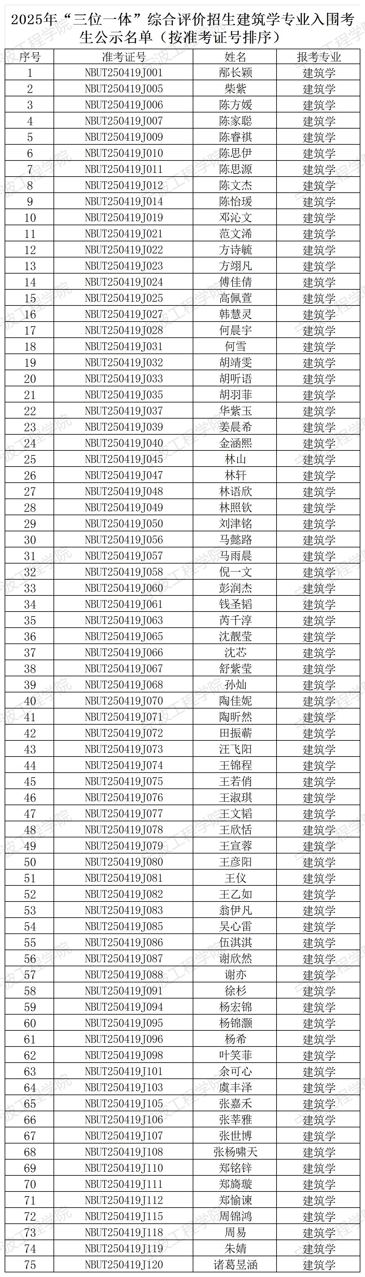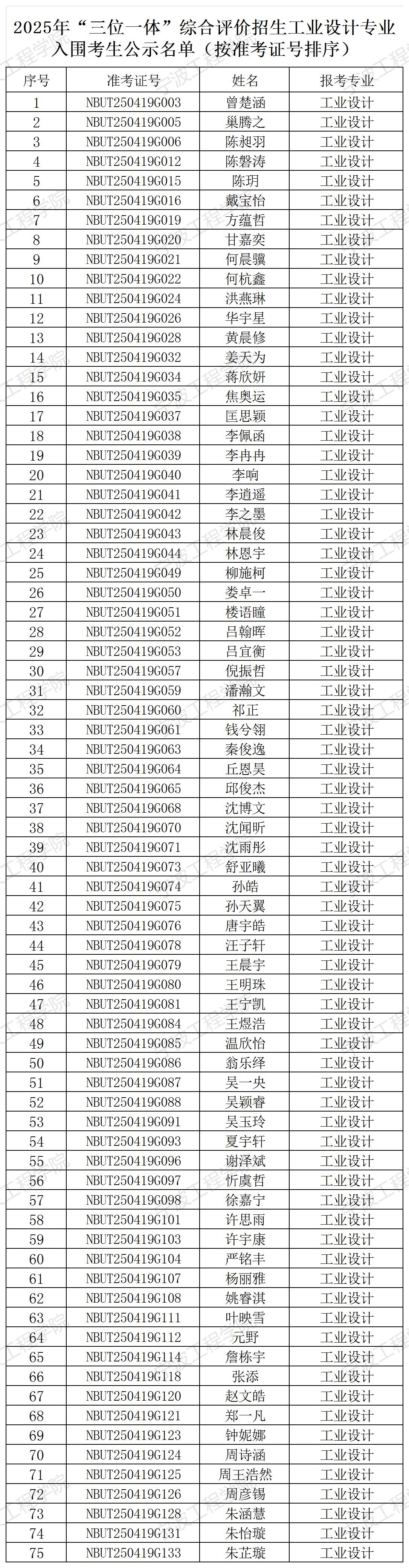 根据浙江省教育考试院《关于做好2025年三位一体综合评价招生工作的通知》(浙教试院〔2025〕20 号)文件精神和《宁波工程学院2025年三位一体综合评价招生章程》规定,经学校综合素质测试,各专业按计划数与入围数1:5比例确定入围考生名单,共有150位考生入围我校2025年“三位一体”综合评价招生。工业设计专业入围考生综合素质测试最高分95.4分,最低分66分;建筑学专业综合素质测试入围考生最高分96.6分,最低分67分。考生可登陆我校“三位一体”综合评价招生报名系统查询成绩。