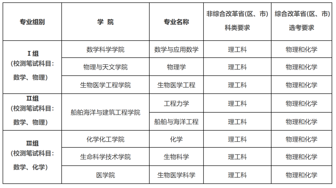 所有按要求完成报名的考生可参加我校组织的笔试(高考后一周内),具体时间安排详见准考证。报考Ⅰ或Ⅱ组的测试科目为“数学、物理”,报考Ⅲ组的测试科目为“数学、化学”。我校将根据笔试成绩,按照不超过各省(区、市)各专业组别招生计划4倍的比例,分别确定各省(区、市)各专业组别笔试通过考生名单,末位同分考生均予以入围。未通过笔试的考生不参与后续环节及录取成绩排序。