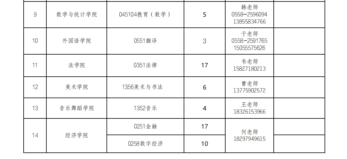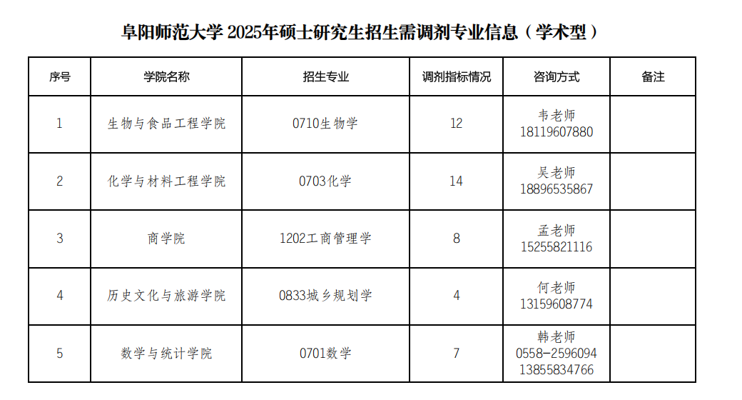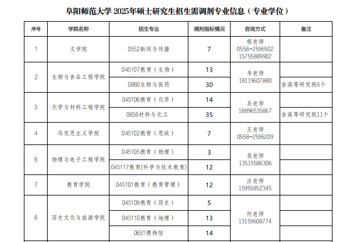 阜阳师范大学2025年硕士研究生招生需调剂专业信息