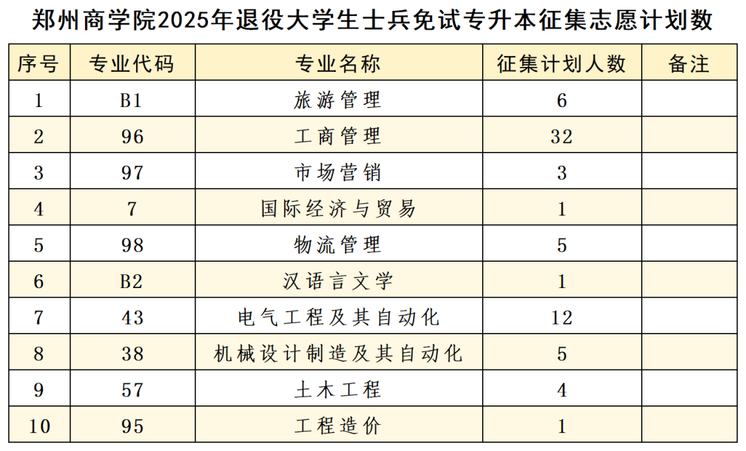 根据河南省教育考试院录取工作安排,我校退役大学生士兵免试专升本按程序投档录取后,部分专业招生计划有余额,现面向参加2025年退役大学生士兵免试专升本联合考查并取得相应成绩,且目前未被任何院校录取的考生进行征集志愿。