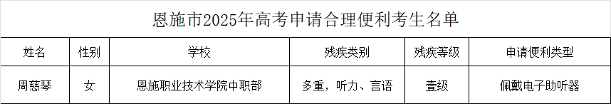 根据《省教育考试院关于做好残疾考生参加普通高考申请合理便利有关事项的通知》,经审核,现将我校申请高考合理便利的考生信息公示如下,公示时间为2025年4月24日—2025年4月28日。