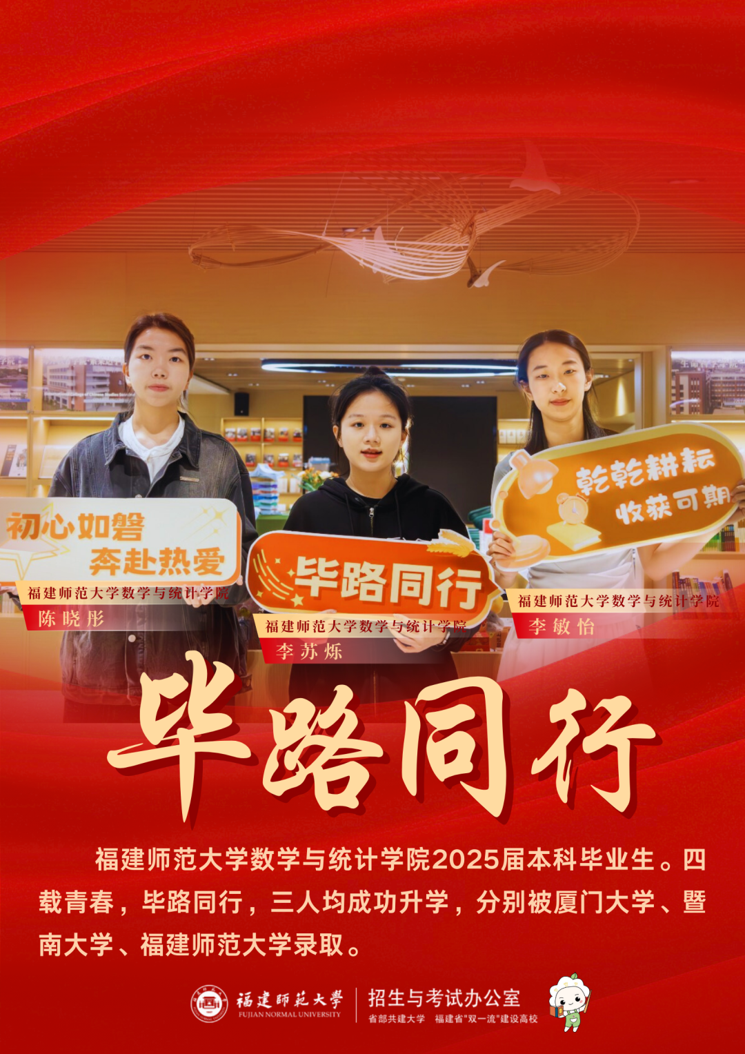 陈晓彤:毕业之际,最想对福建师大说一声感谢。感恩四年的培育,更庆幸与师道匠心、同窗挚友的相遇。四年里,统计学的课程让我打下扎实的数理基础,老师们不仅教会我公式推导,更通过案例让我理解数据如何解决实际问题。和同学们一起参加建模比赛、支教活动以及学生工作的经历,让我懂得团队协作的力量,也坚定了用专业知识服务社会的信念。从清晨到深夜的自习室,到星雨湖畔的漫步散心,都成了珍贵的回忆。希望福建师大能继续培养更多优秀的学子,在学术和实践中不断突破。未来无论走到哪里,我都会记得福建师大教给我的严谨与踏实,努力用数学思维创造价值。
