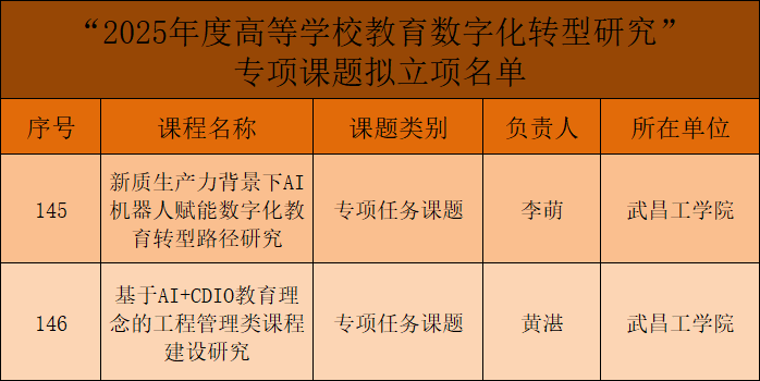 本网讯(通讯员 杨欣淼)近日,高校毕业生就业协会公布了“2025年度高等学校教育数字化转型研究”专项课题拟立项名单,我校李萌老师主持的《新质生产力背景下AI机器人赋能数字化教育转型路径研究》和黄湛老师主持的《基于AI+CDIO教育理念的工程管理类课程建设研究》两项课题成功入选。此次立项标志着我校在教育数字化转型领域的科研实力和创新实践再获权威认可。