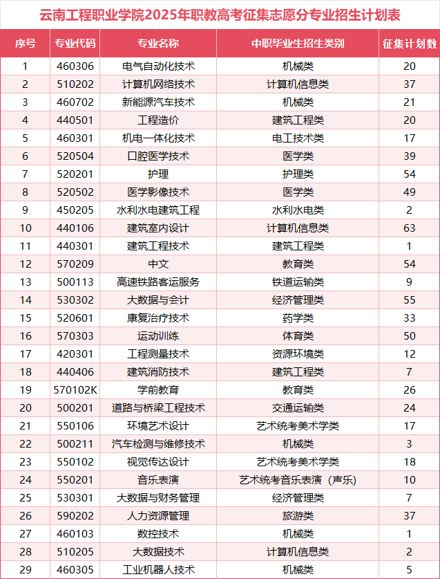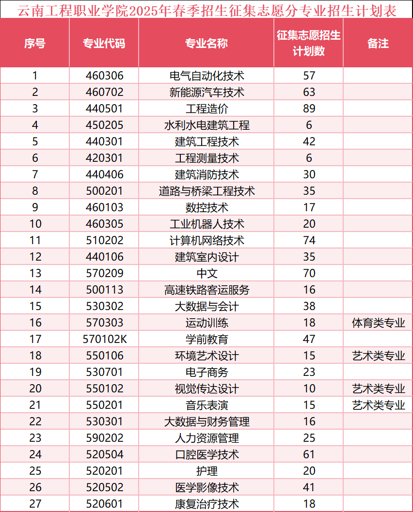 云南工程职业学院2025年职教高考、春季招生考试征集志愿工作定于4月25日至4月26日进行,现学校部分专业尚有空余计划参加征集志愿,具体相关信息如下: