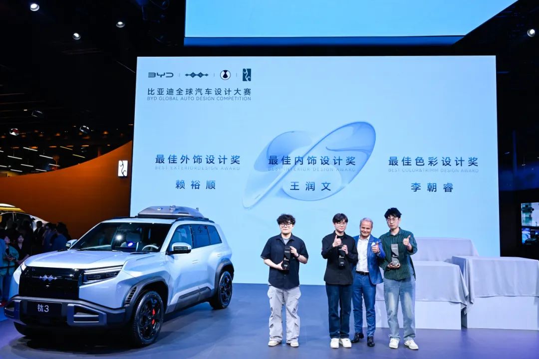 2025年4月23日,比亚迪全球汽车设计大赛颁奖典礼于上海国际车展方程豹展区盛大启幕。来自清华大学美术学院、中央美术学院等五大顶级艺术院校的专家评委亲临颁奖典礼现场。比亚迪王传福总裁为来自天津美术学院的冠军选手赖裕顺颁奖。