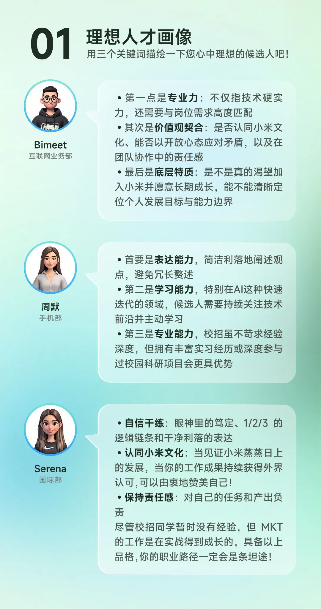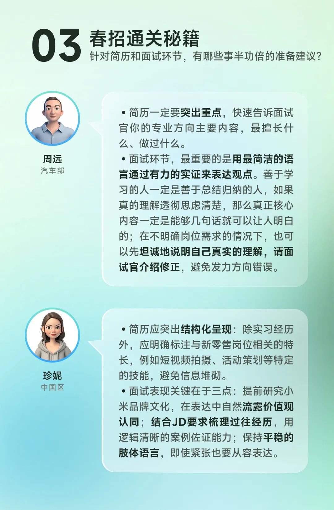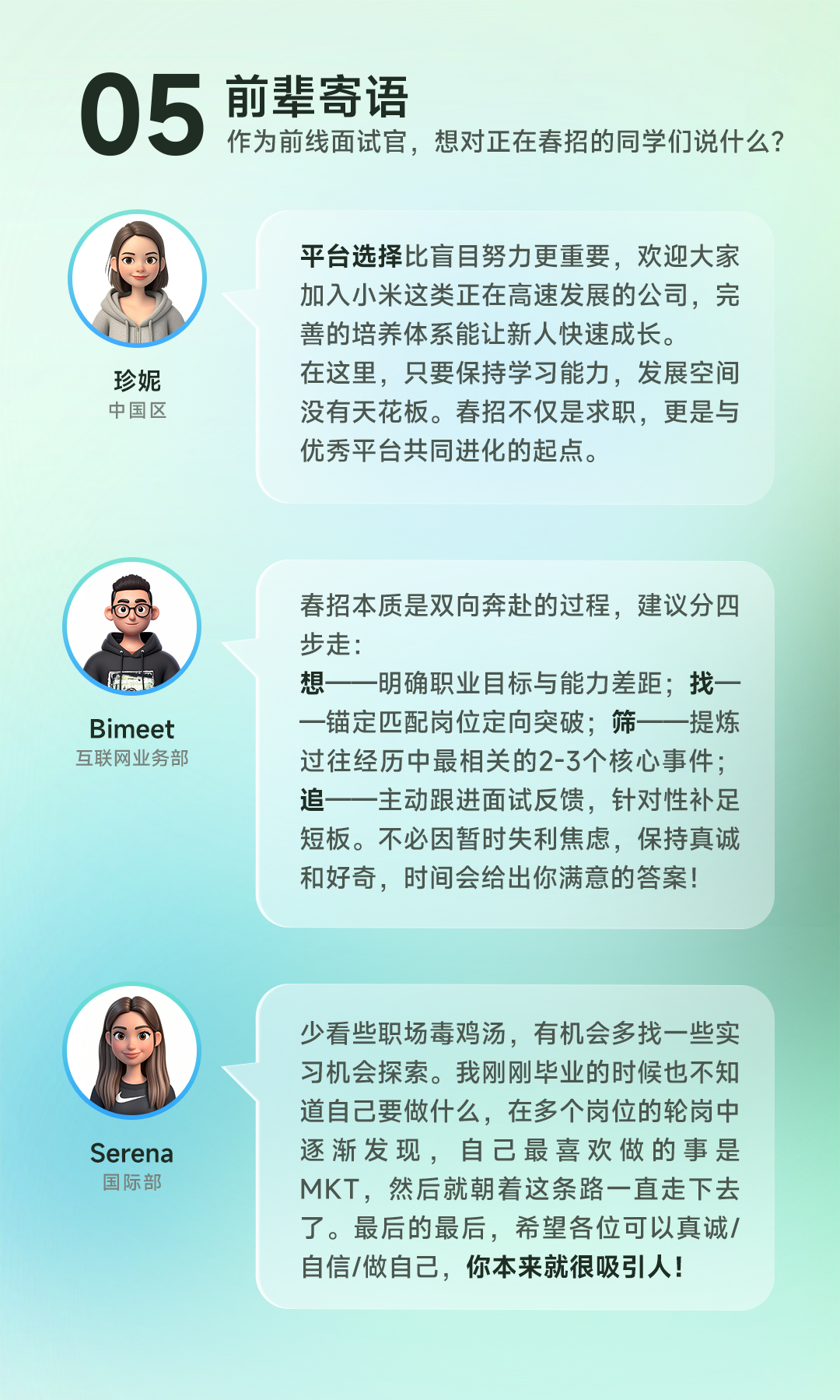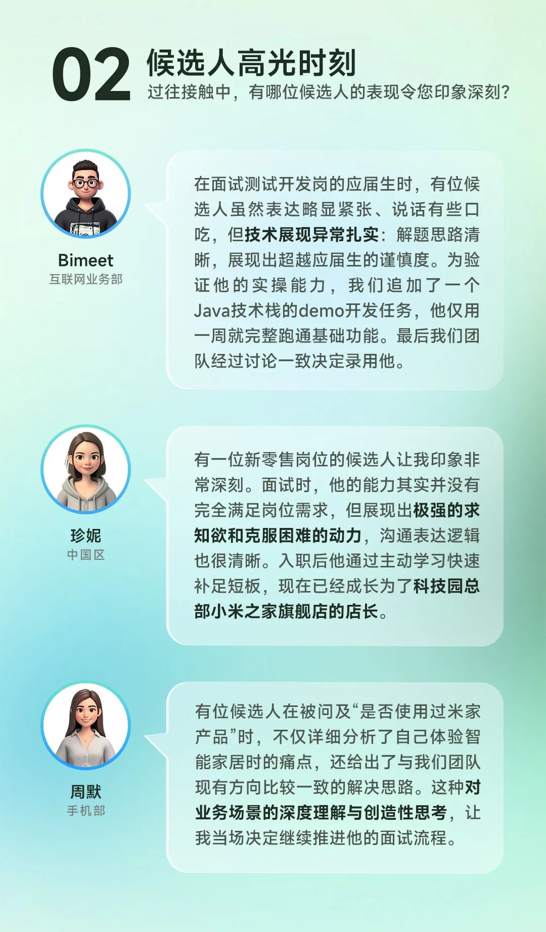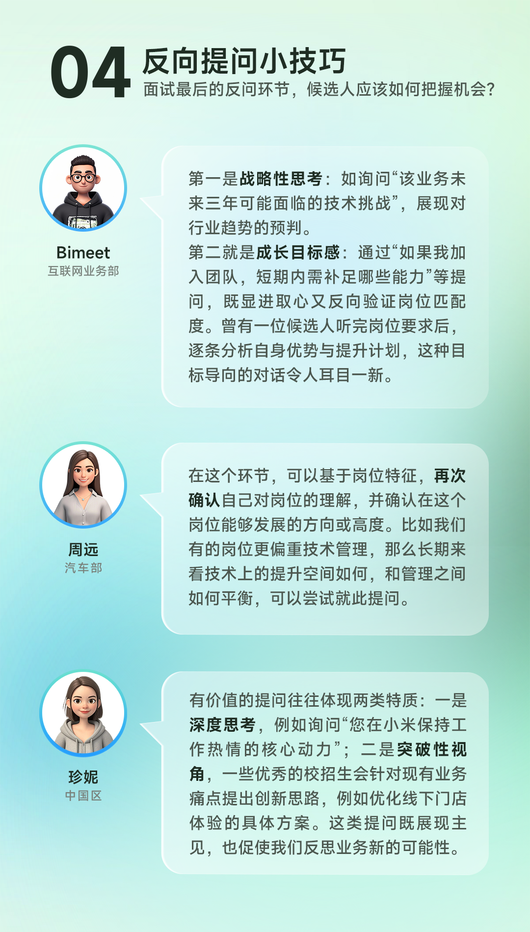 终极反问环节怎样设计才能进退得体?我们对话了5位来自小米不同部门的优秀面试官尝试从他们的数百场面试中提炼出黄金法则助你把握春招关键机遇!🏃想成为让小米面试官眼前一亮的候选人?速看这篇!🪄🪄
