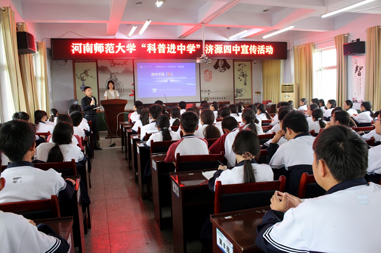 4月21日,河南师范大学教育学部党委书记陈勇一行先后走进济源一中和济源四中开展“科普进中学”及招生宣传活动,济源一中校长汤初胜,济源四中党总支书记杨建东、校长穆庆宇,两所中学、骨干教师以及1000多名高三学生分别参加活动。教育学部党委副书记康淑霞,宣讲人员梁云真、胡金艳和尹晓炯等参加活动。