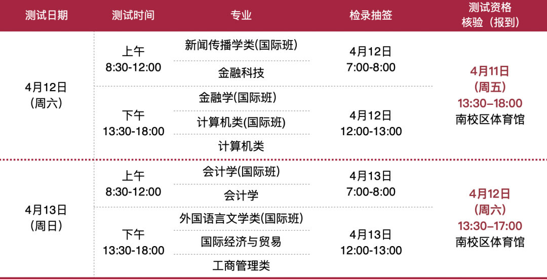 2.抽签:测试当天考生凭身份证、已加盖核验章的测试通知单按规定时间进入博闻楼考区(上午8:00前,下午13:00前,逾期未进入考区视为放弃测试)→物品寄存→安检→身份核验→检录抽签→面试→测试完成离场。