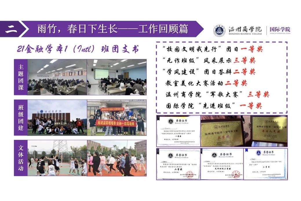 作为班级团支书,协同班委共同推进团支部“三自教育”,活用软件督促全班同学完成青年大学习,动员同学参加各类活动,凭借优越的协调统筹能力,她所在的班级多次被评为“先进班级”。团学生涯中,她凭借个人的组织领导能力,大大小小举办30余场文体活动,参加上百场学院活动,任职部长期间更是带领国际学院在校运会上首次勇夺桂冠!