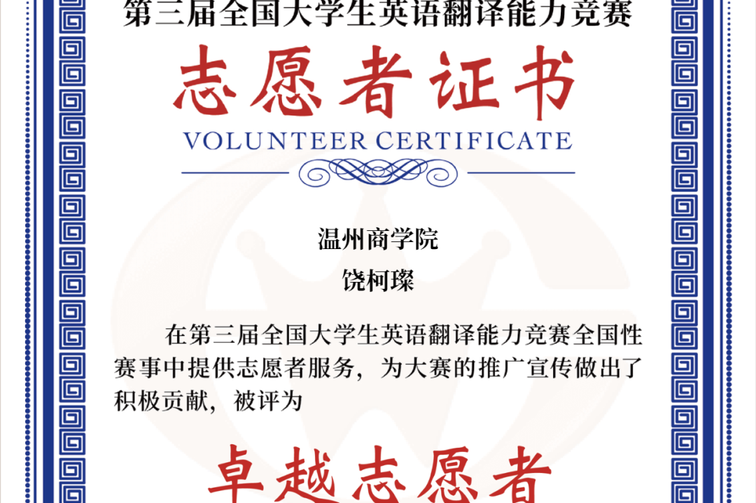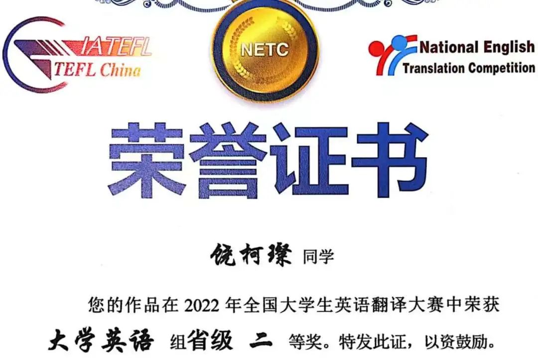 - Second Prize in the 2022 National English Translation Competition for College Students (Provincial Level)