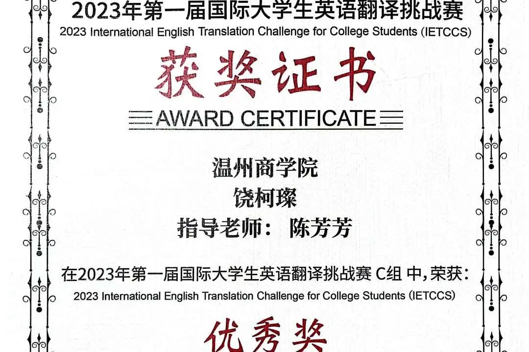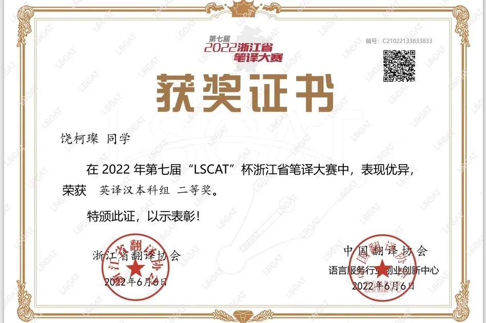- Second Prize in the 2022 "LSCAT" Cup Zhejiang Translation Competition (English-Chinese, Undergraduate Category)