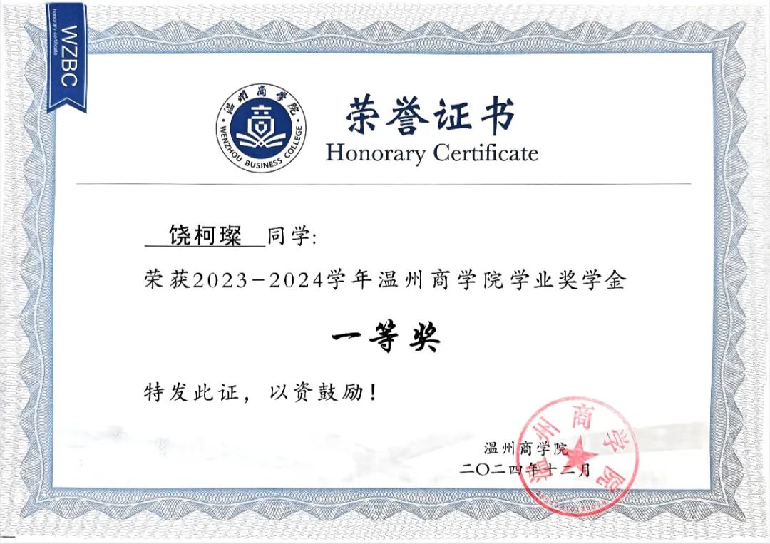 Maintaining a top GPA in her program for three consecutive years was her self-imposed "mandatory course." The morning light and evening lamps in the library witnessed her relentless pursuit of excellence in every subject. This dedication earned her honors like the Zhejiang Provincial Government Scholarship, First-Class Academic Scholarship, and "Outstanding Student" awards. She also aced her IELTS on her first attempt, meeting direct entry requirements for overseas universities.