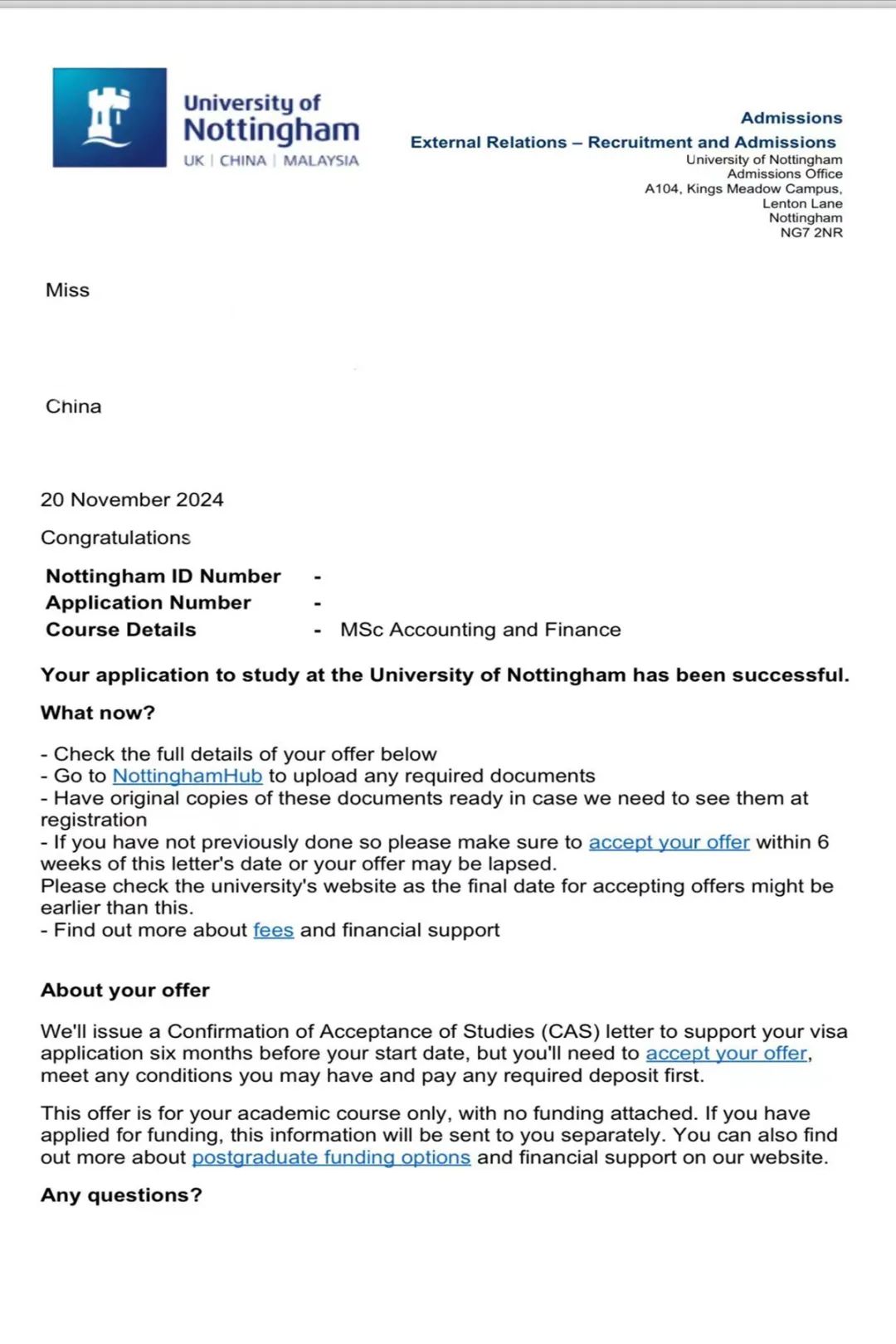 “在文书材料准备上,我会仔细研究每所大学、每个专业的申请要求,针对每所院校定制差异化材料”。她的各项申请材料里,几乎每一所大学的申请材料亮点都有所不同,在文书撰写方面她也有小妙招要分享。在文书中要体现学术衔接性,如需要跨专业转型,则提供多维度的支撑点,深度了解目标专业课程特色与优势。饶柯璨回忆道:“在利兹大学的申请文书中,我就特意结合了过往参加浙江省经济案例分析大赛的经历,这与我所申请的利兹大学地球与环境学院的专业息息相关,招生官十分认可我的学科背景与实践经历的契合度,我也同时收获了利兹大学国际卓越奖学金(£3300,学费减免10%)。”