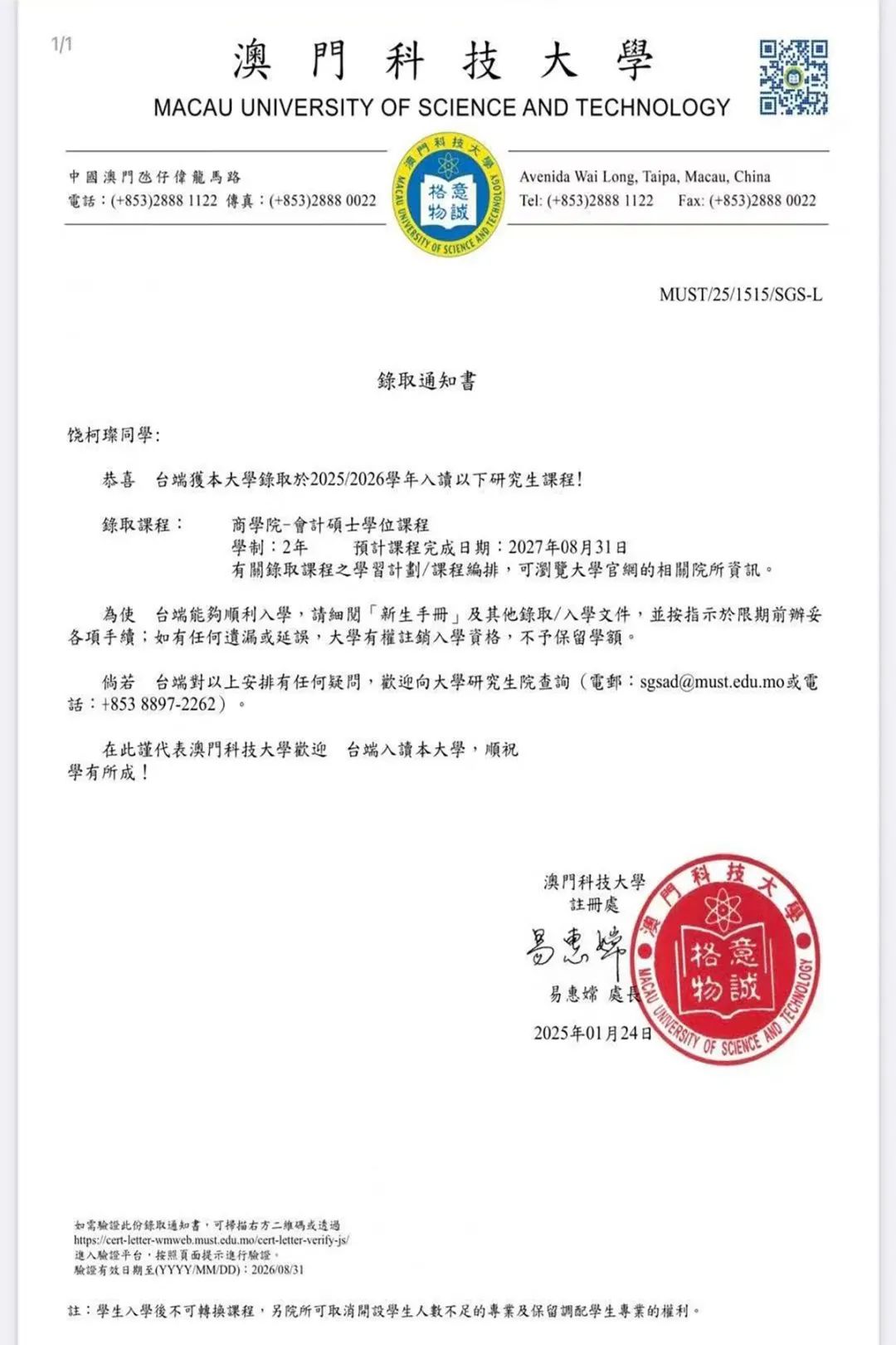 She applied in waves, prioritizing schools by competitiveness. "I couldn’t predict outcomes, but the results justified our efforts." She also DIY-ed applications to Hong Kong and Macau universities, acing interviews through thorough preparation, culminating in an offer from Macau University of Science and Technology.