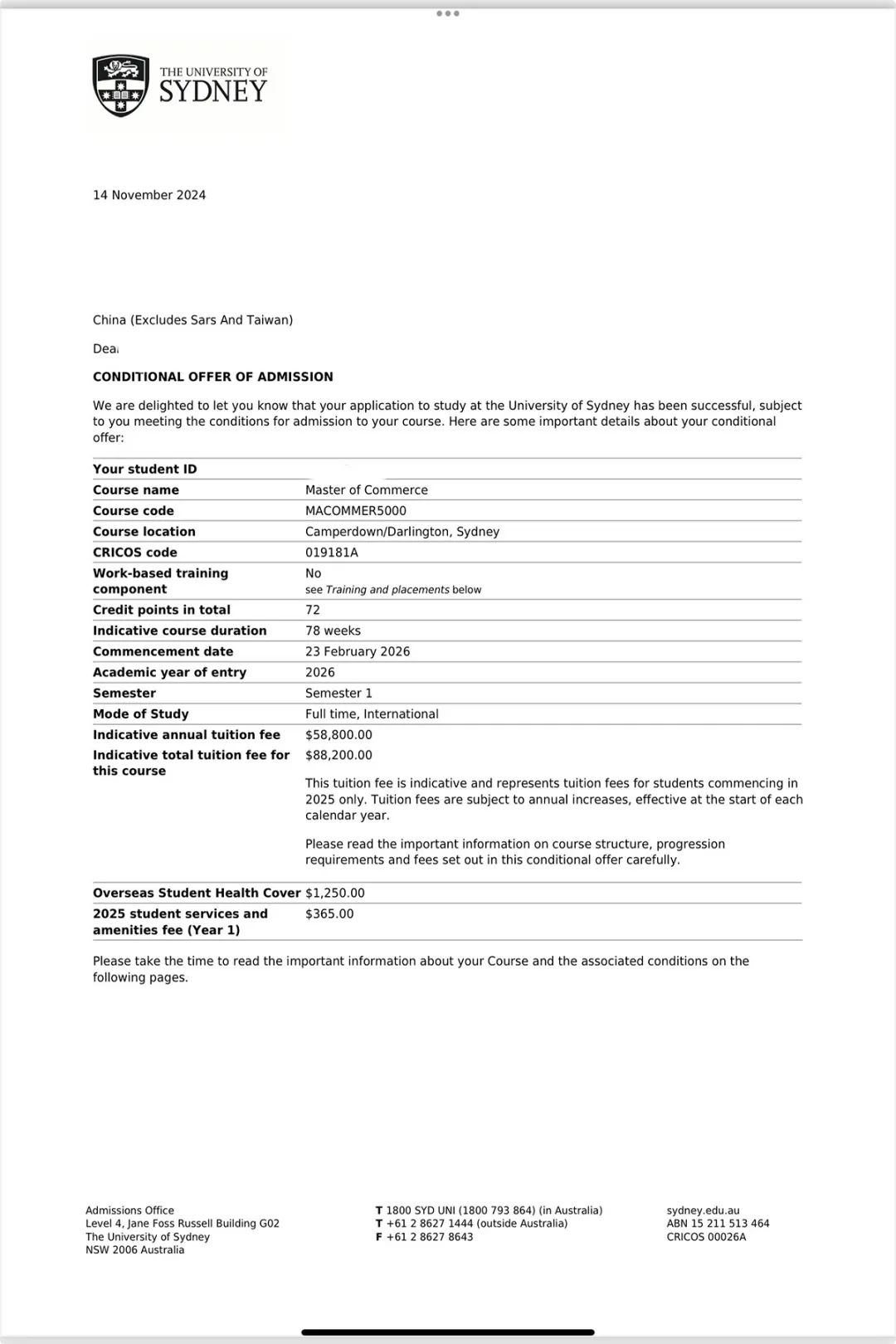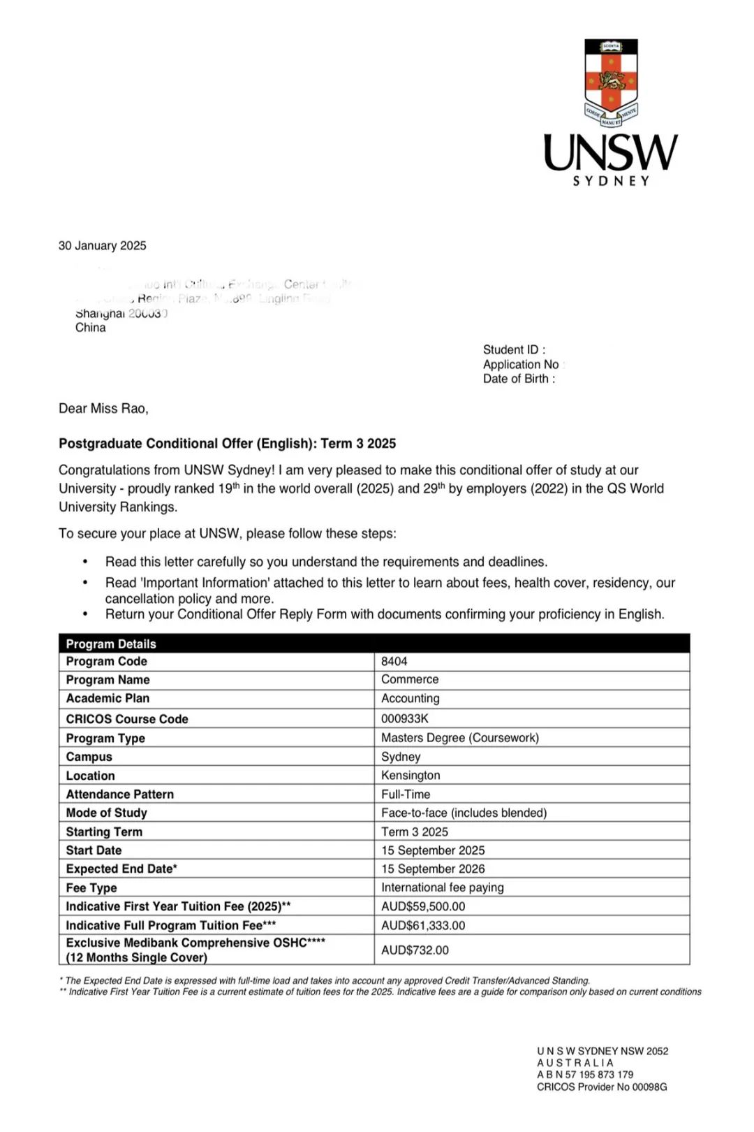 “我的申请之路只是看上去一帆风顺,其实刚开始我也不是很确定自己到底想要学什么,英国还是澳洲,继续学商科还是换个专业尝试一下,这些因素都让我感到犹豫不决。但是非常感谢金牌导师:唐思桐老师和蔡梓彤老师,他们两位在我的申请过程中付出了很大的努力。唐老师与我商讨择校方案,理性分析我的情况,以及我适合申请的专业,制定‘冲刺——匹配——保底’三级选校方案,让我认真考虑,做好两手准备,这为我后续申请少走太多的弯路。蔡老师在我申请澳洲学校时多次与院校招生官沟通,为我的申请保驾护航。”
