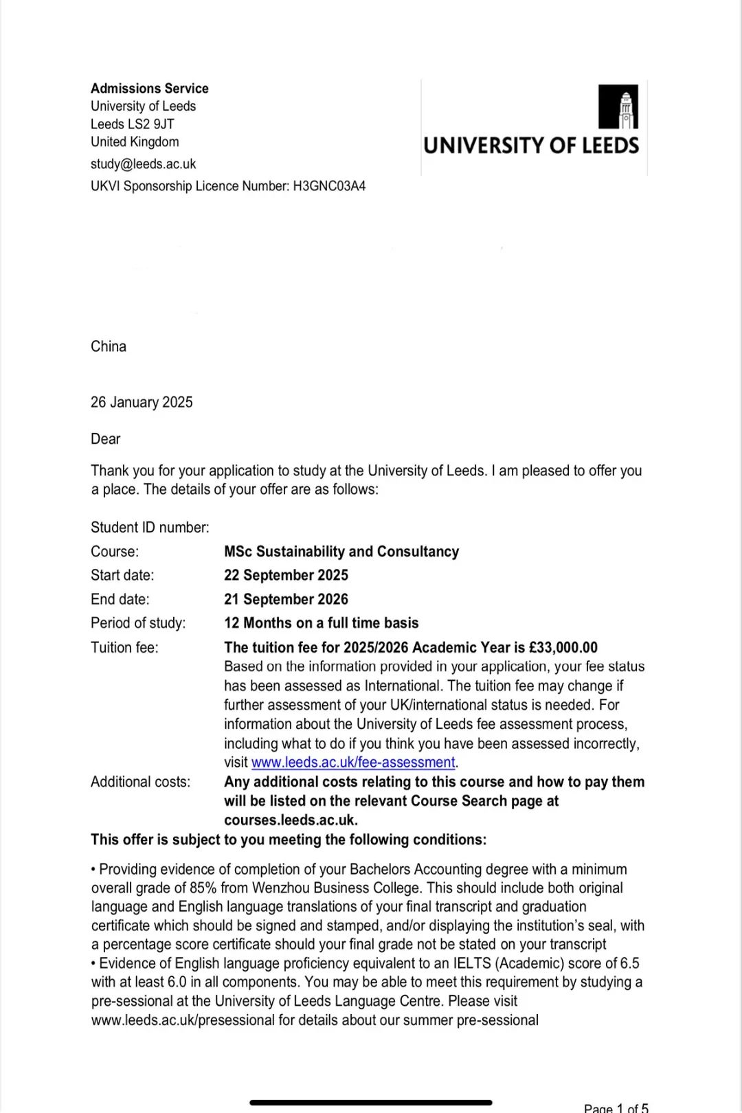 "I tailored each application to the university’s specific requirements. For Leeds’ Earth and Environment program, I highlighted my experience in the Zhejiang Economic Case Analysis Competition, aligning my background with their curriculum. This earned me their International Excellence Scholarship (10% tuition waiver)."